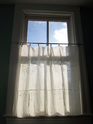 To illustrate, this is the “temporary” window treatment I put in our master bathroom. It’s been up for four and a half years. I’d just unearthed the 28th UNOPENED box of linen handkerchiefs my grandmother had squirreled away for, oh, forty years or so, and I resolved to put them to use. (You’ll be using more festive, colorful pieces in your kitchen, though.)
