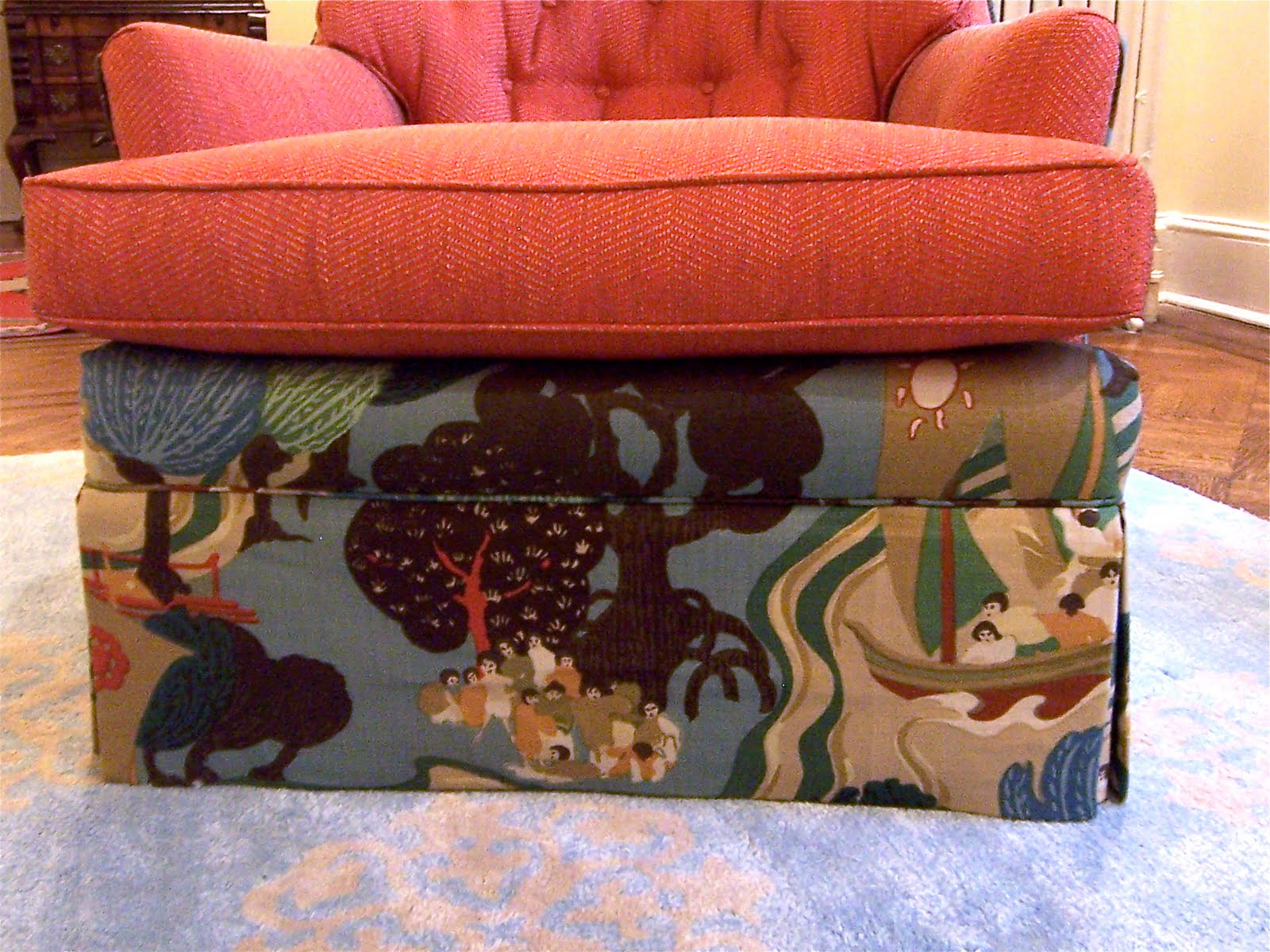 The front skirt does line up with that part below the cushion (help me with the vocab again, designers among you?), which is now the patterned fabric, not the orange. That was just odd.