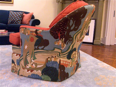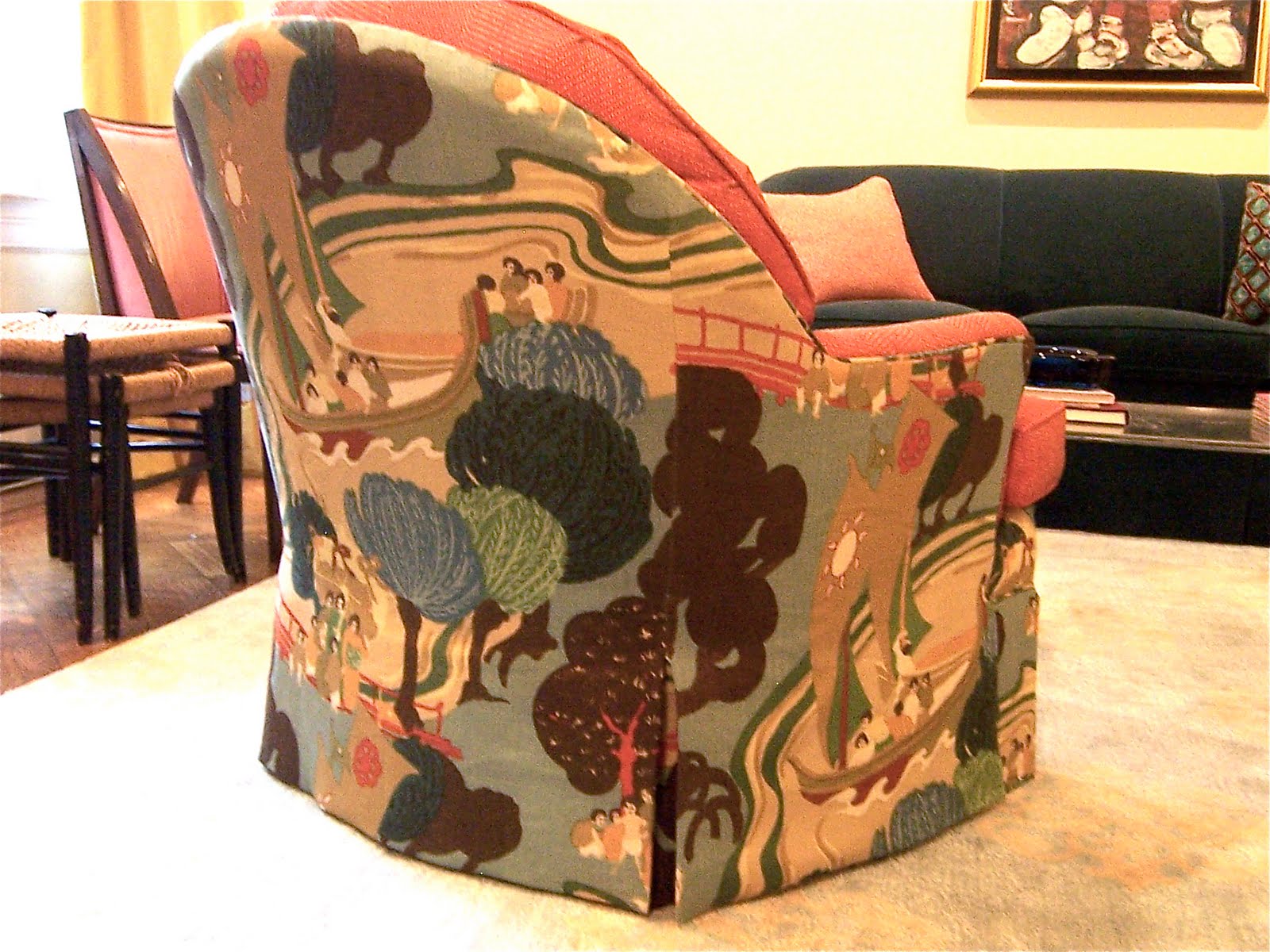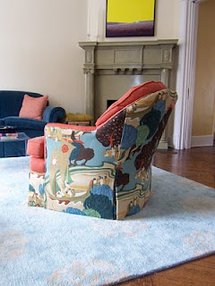 My living room chairs are back. You’ll recall that there was a problem with the upholstery: the back pattern wasn’t lining up, part of the front was orange when it should have been patterned, etc. etc.