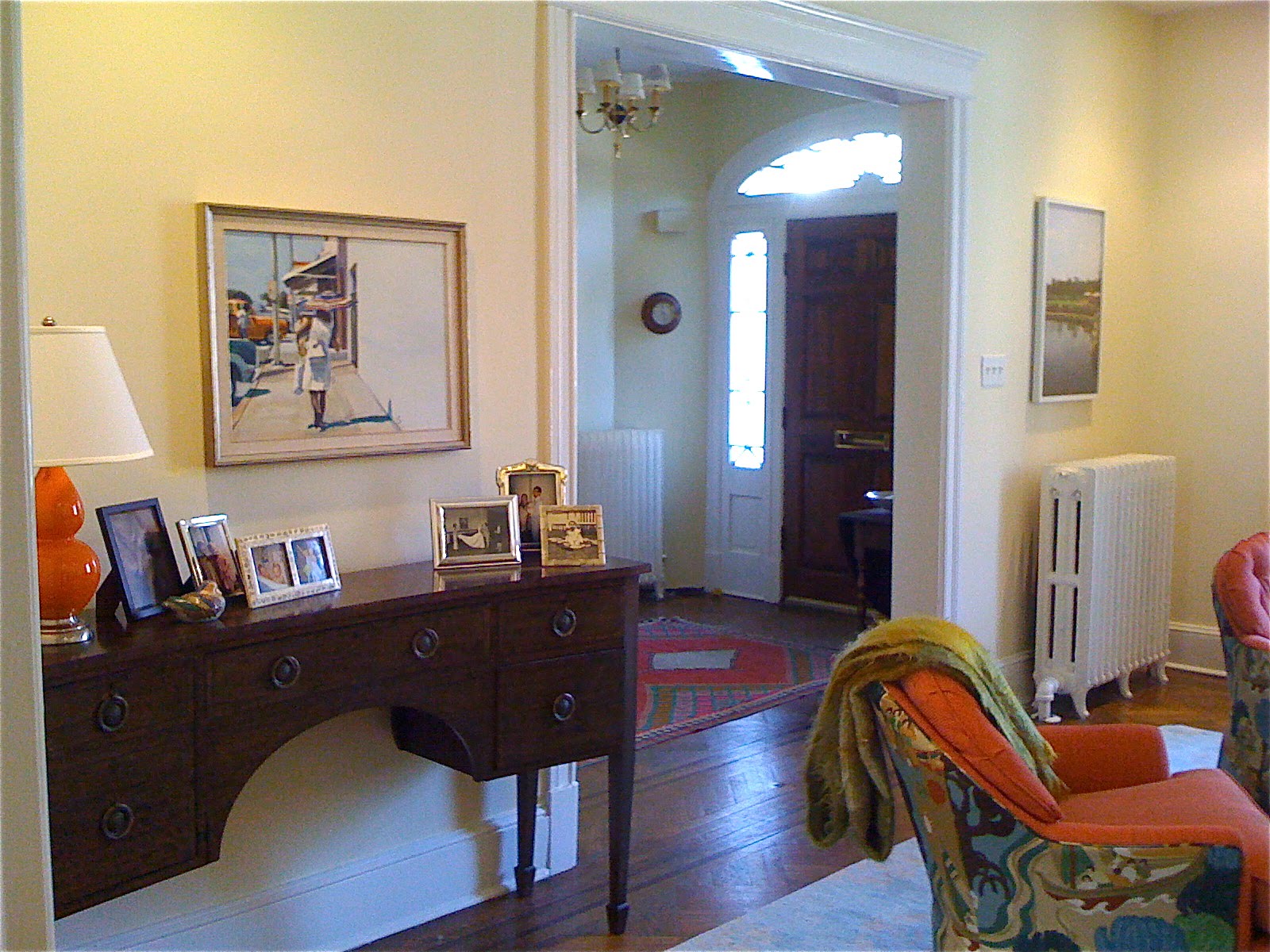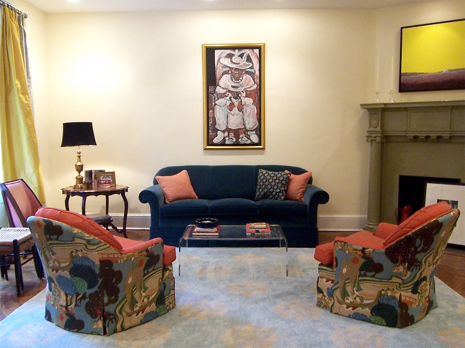 The lamp is too small – I “stole” it from my office when we were having that event here – and I feel like the orange is now overpowering the yellow in the room. So the new lamp is blue.