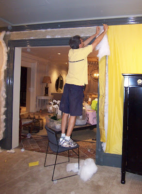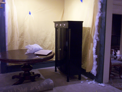 My husband and I went down today to get a jump on the demolition. I have to remove the wallcovering, lighting, faux elevator…everything that I don’t think the next designer would want to work with. (e.g.: the “silk” walls? Coming down. The adjusted door frames and new moulding? Staying.)