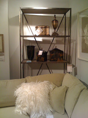 I also found a terrific open bookshelf today at Robert Allen – which is providing a lot of furniture for the foyer portion. The longer you look in these showrooms, the more stuff you find. Funnily enough, this has been used in the Design House before, possibly in a bathroom. Hey, if it works, it works.