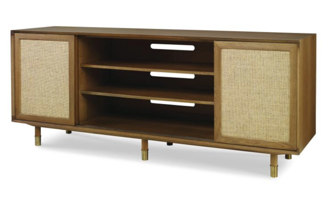 Here’s an elegant media cabinet in wood, raffia, and brass: