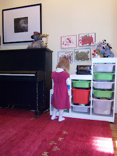 My approach to kids’ spaces – it’s my approach for most projects, actually – is to mix in the less expensive pieces with the “real” stuff. Our playroom, for example, has a red Gabbeh rug, a charming upright piano that belonged to my children’s great, great grandmother; this Trofast toy storage thing with red, green, and white bins; a sofa upholstered with fabric from India, and a small Ikea table and chairs. The overall effect is fun but not cheap. And the room will age well simply by deaccessioning the Ikea stuff. A computer desk might eventually replace the bins, we’ll swap out the knee-high table for a grown-up sized game table…you get the idea.