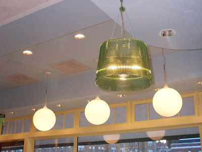 Her complaint is that it’s cold and sterile, that it isn’t a place you’d want to hang out. I disagree, but it’s hard to explain why, since there’s no question that cool tones and non-warm-and-fuzzy materials dominate the space. There’s a lot of white plastic…I was just talking about Saarinen knockoffs, and the white tables and chairs are exactly that.