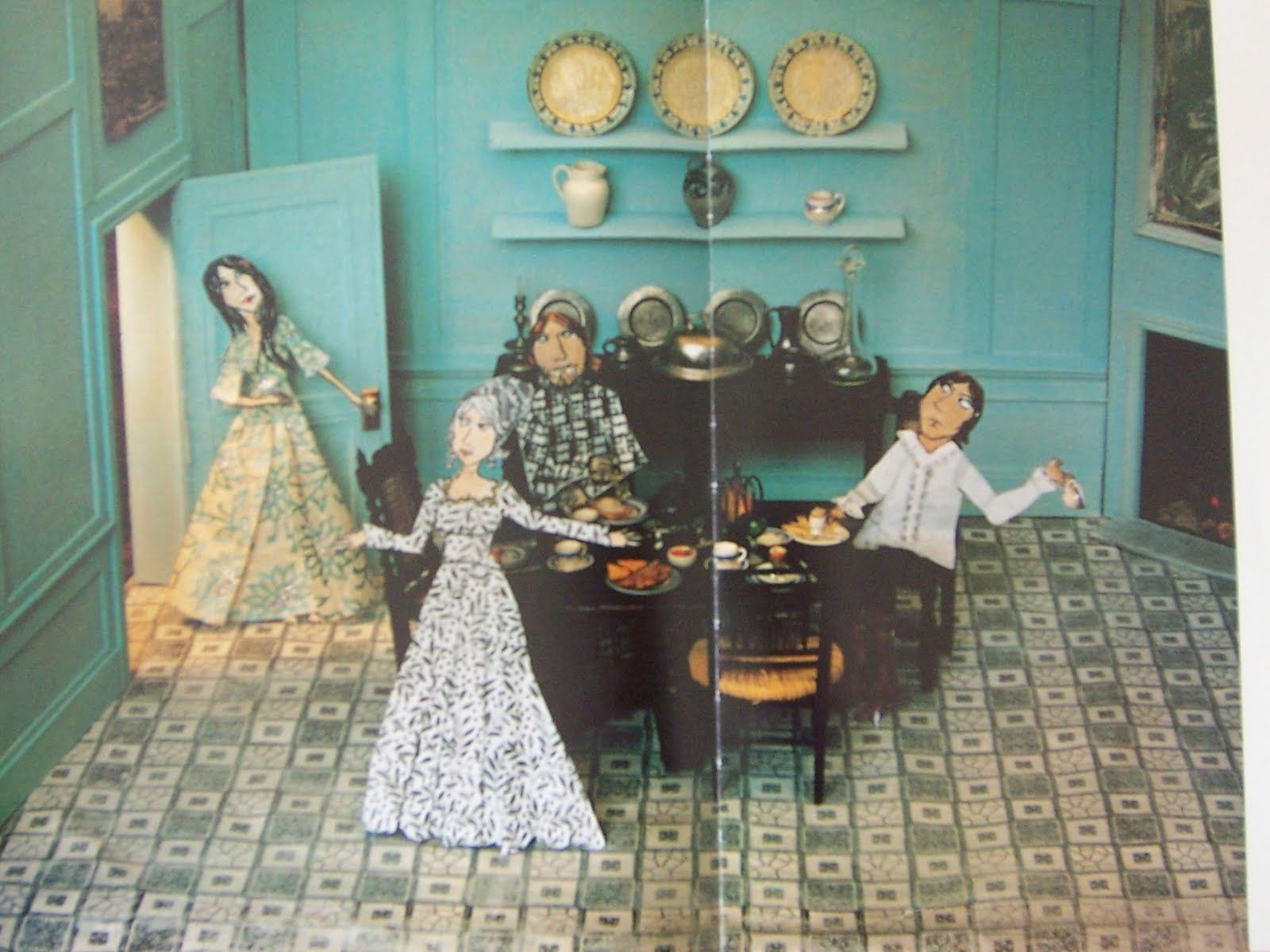 Interiors! Beautiful ones! They’re little dioramas, with 2-D cartoon people inserted into them.