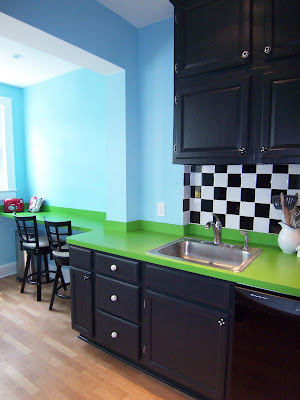 Here’s a kitchen renovation in which we installed Microdot countertops in Vibrant Green. We were working with a tight budget, but the client’s Dorothy Draper obsession meant that bold colors and graphic patterns could play a starring role. These are 3 before/after pairings:
