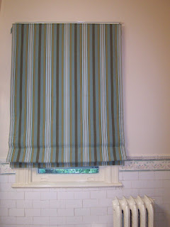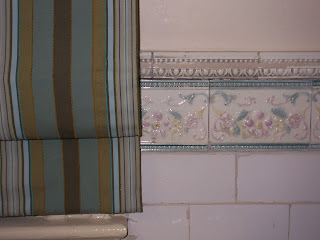 The next thing we did was add a strong window treatment so the tile isn’t the only interesting thing to look at. We had a Roman Shade made in this striped Robert Allen fabric (Hull – Kiwi), and although it’s tough to see in this picture, the colors are intentionally clashy with the tile. (I love these clients!) The bold stripe also gives the traditional bathroom a modern edge. The clients are pleased, and the investment was modest.