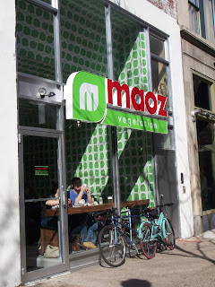 Wallpaper? I thought. But no, it was tile – tile on the walls and on the ceiling of a fairly new chain of vegetarian restaurants called Maoz. According to its website, Maoz has precious few outlets in the U.S. so far: several in NY, 2 in Phila., one in Florida, and one coming to DC soon, it promises.