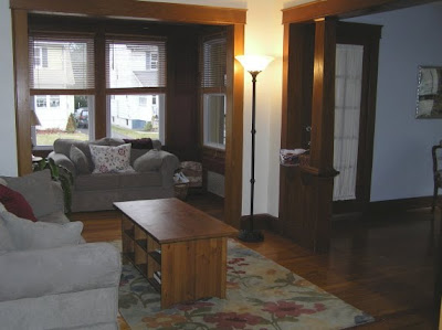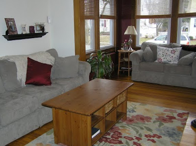 My biggest problem is that my living room and dining room are open so I want it to flow right. I also have an area attached to my living room that was was converted from a porch. I painted this area red and the dining room blue and I am not at all happy with it. As you can see, I have dark trim and wood floors so I was trying to brighten up the space.