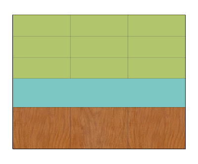 On the opposite wall, paint the upper shelves color #3 (green), and the backsplash color #2 (blue).