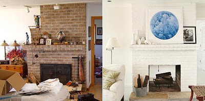 Back to you, though: Definitely remove the chair rail, and I agree with changing the fireplace. You could simply paint the fireplace, though – an eggshell finish, not semi-gloss. Here’s a before and after from Domino (sigh) several years ago, courtesy of xJavierx on Flickr: