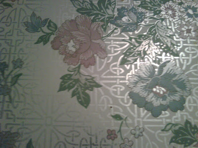 The bad news (part 1) is that the bath is wallpapered in this so-hideous-it’s-almost-great wallpaper, which has a silver geometric pattern with a light blue, sage green and pale pink floral pattern over the top of it.