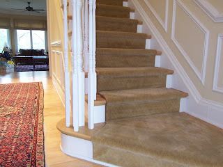 Ultimately, you can’t go wrong with a low, tight pile in a solid color or a pattern. A client of mine just installed this lovely diamond patterned rug on her stairs (above and below). The subtle pattern is just enough to hold its own in the context of the Persian rugs nearby, and it’s synthetic, so it withstands the clients two cats and three children very well :)